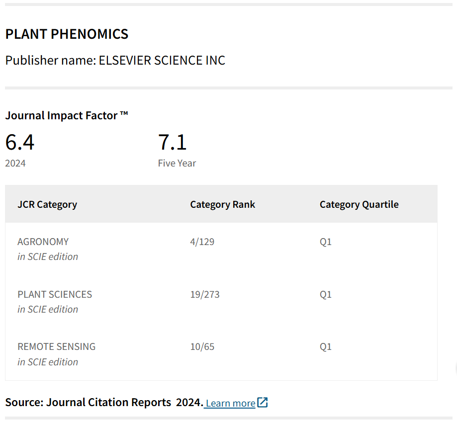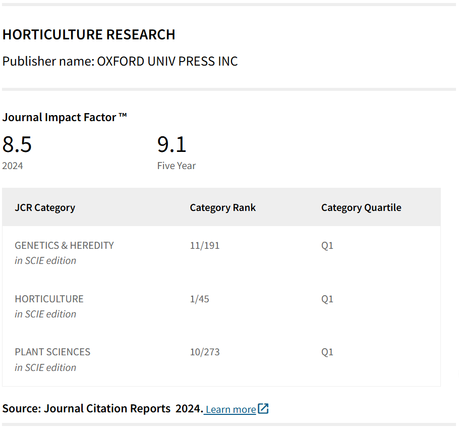 6月18日,科睿唯安最新版的《期刊引证报告》(JCR2024)正式发布。万象城三本英文期刊全部进入JCR,期刊国际影响力持续增长。《园艺研究》(Horticulture Research)影响因子8.5,再次位列园艺领域榜首;《植物表型组学》(Plant Phenomics)影响因子6.4,稳居领域前列;《生物设计研究》(BioDesign Research)首个影响因子4.7,进入领域一区。