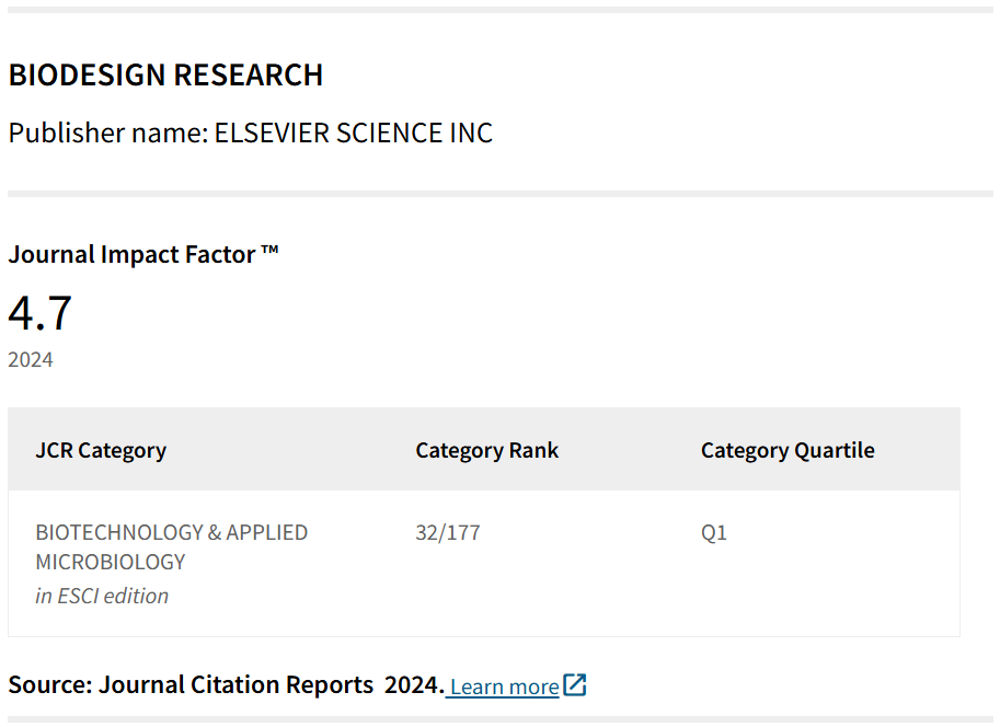 《生物设计研究(英文)》2020年创刊,刊载范围包括基因组编写和重写、生物工程、生物设计方法和工具、生物设计理论和生物设计应用。期刊已被DOAJ、PubMed Central、Scopus、ESCI等数据库收录。2021年入选中国科技期刊卓越行动计划高起点新刊项目。