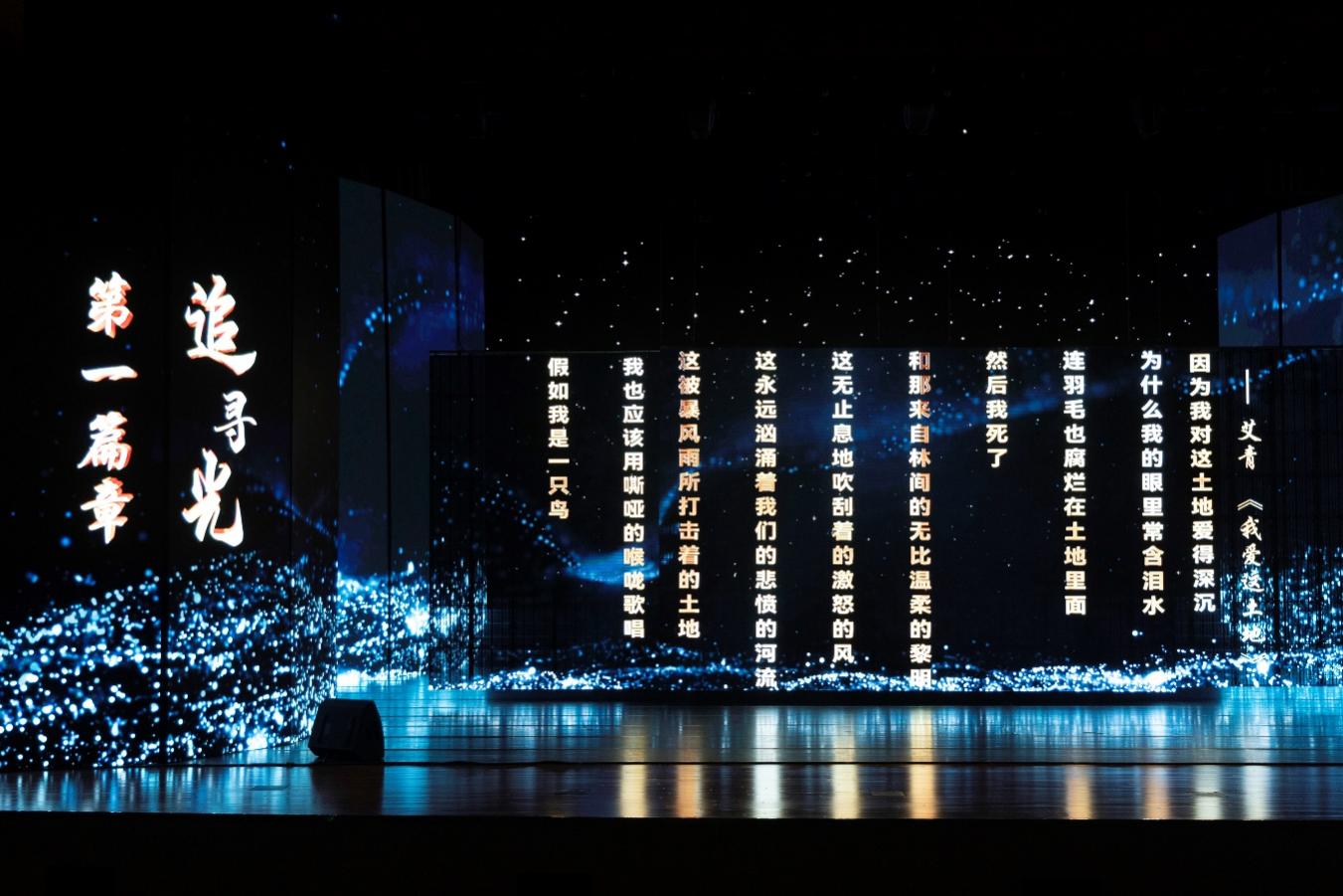 在“成为光”篇章,南京大学、东南大学、江南大学的学生们共同表演了歌舞《寻光》,同济大学、安徽师范大学、河海大学的学生们先后朗诵了《忠诚》《世纪交响》《青春的阵线》三份作品,通过赤子的深情倾诉,将历史厚重感与青春生命力交融,以声浪传递跨越时空的精神共鸣。