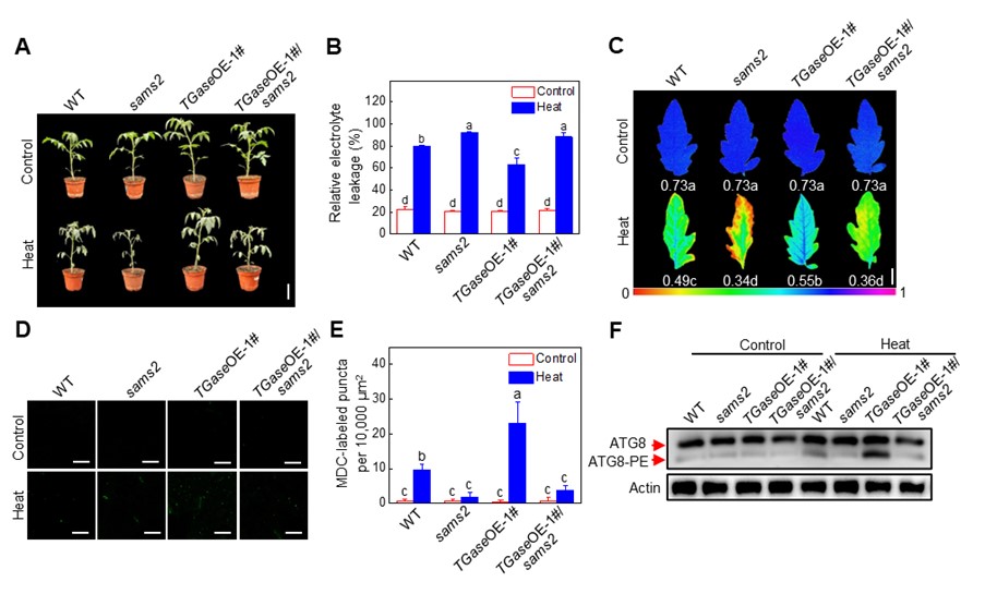 图2. SAMS2基因在TGase诱导番茄耐热性和自噬体积累中的功能分析。