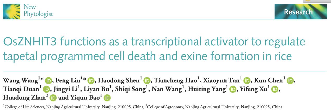 近日,万象城awcsport官网生命科学学院鲍依群课题组在植物学国际权威期刊New Phytologist在线发表了题为“OsZNHIT3 functions as a transcriptional activator to regulate tapetal programmed cell death and exine formation in rice”的研究论文,揭示了水稻雄性核不育调控的新机制,并为遗传改良提供了潜在靶点。