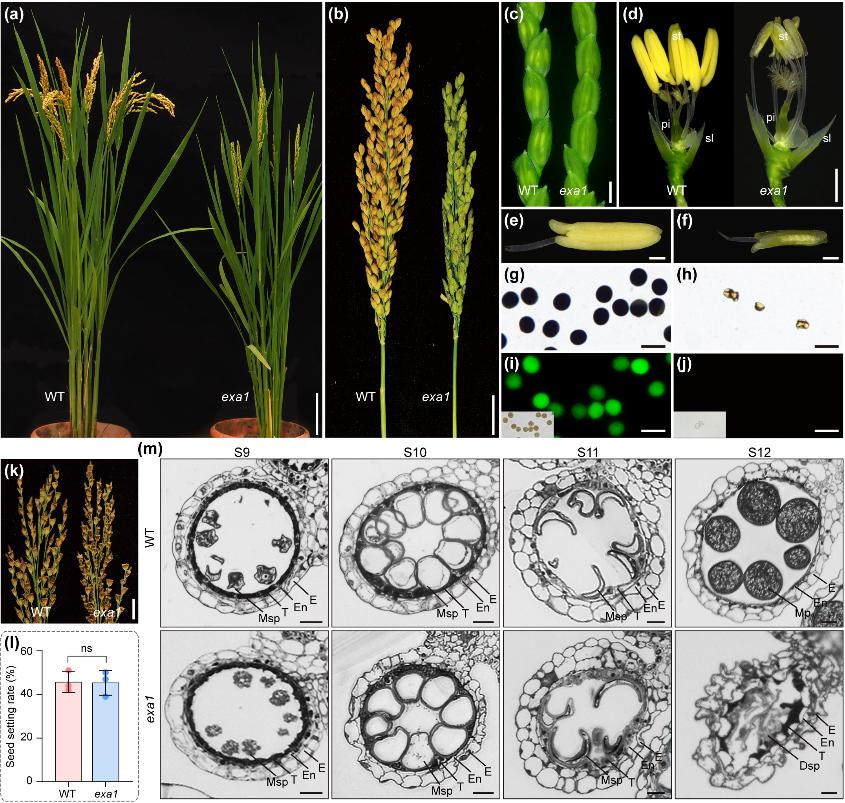 水稻的雄性发育是一个高度协调的过程,绒毡层的发育与程序性死亡(PCD)是保障花粉正常发育的关键。该研究发现的EMS诱变突变体exa1表现为雄性不育。exa1的花粉败育,绒毡层程序性死亡(PCD)延迟,花粉外壁的结构异常。