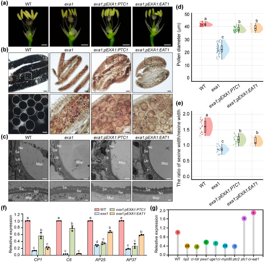 已有研究表明,多个转录因子(如TDR、MYB80、PTC1和EAT1等)共同调控绒毡层细胞PCD及花粉壁形成,但其调控网络尚不完善。转录组分析显示,在exa1突变体中,调控绒毡层PCD的关键转录因子PTC1和EAT1及其下游基因表达显著下调;通过在exa1背景下表达pEXA1:PTC1或pEXA1:EAT1,可部分恢复花药外观、花粉形态及花粉外壁结构。这些结果表明,EXA1可能位于PTC1和EAT1上游,参与调控绒毡层PCD与花粉壁形成。