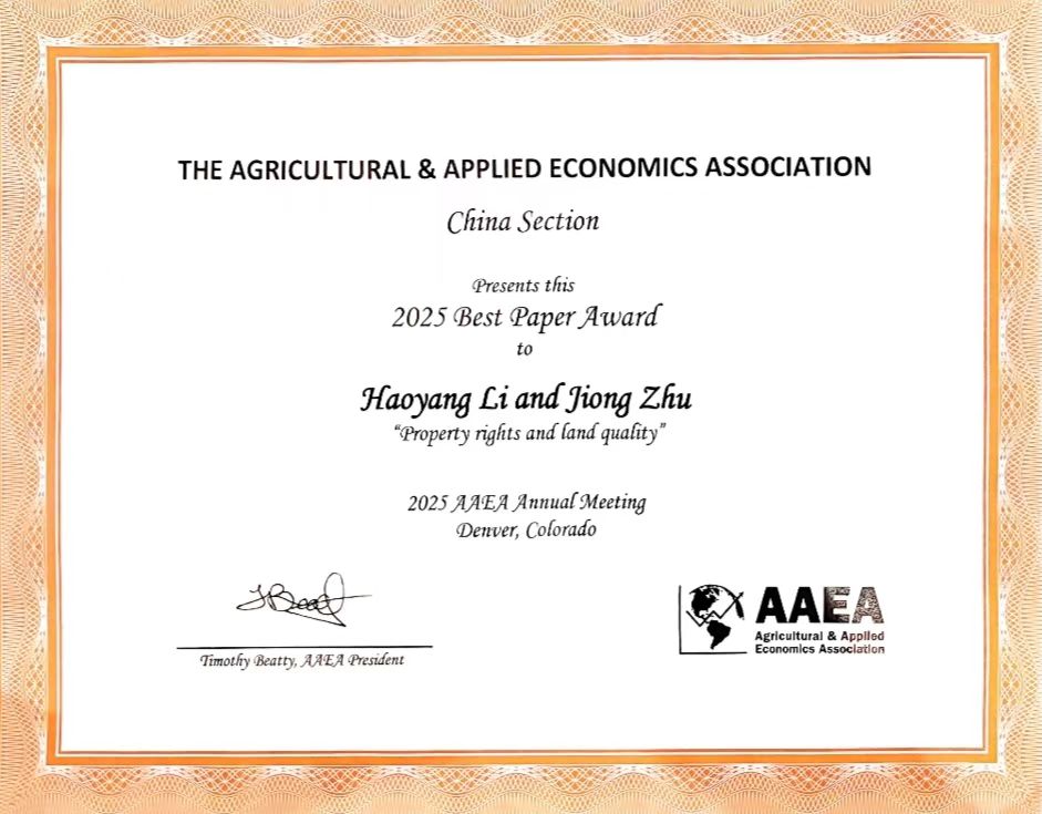 近日,美国农业与应用经济学会中国分会公布了2025年最佳论文奖,万象城awcsport官网经济管理学院李昊洋教授的合作论文《Property Rights and Land Quality》获此奖项。
