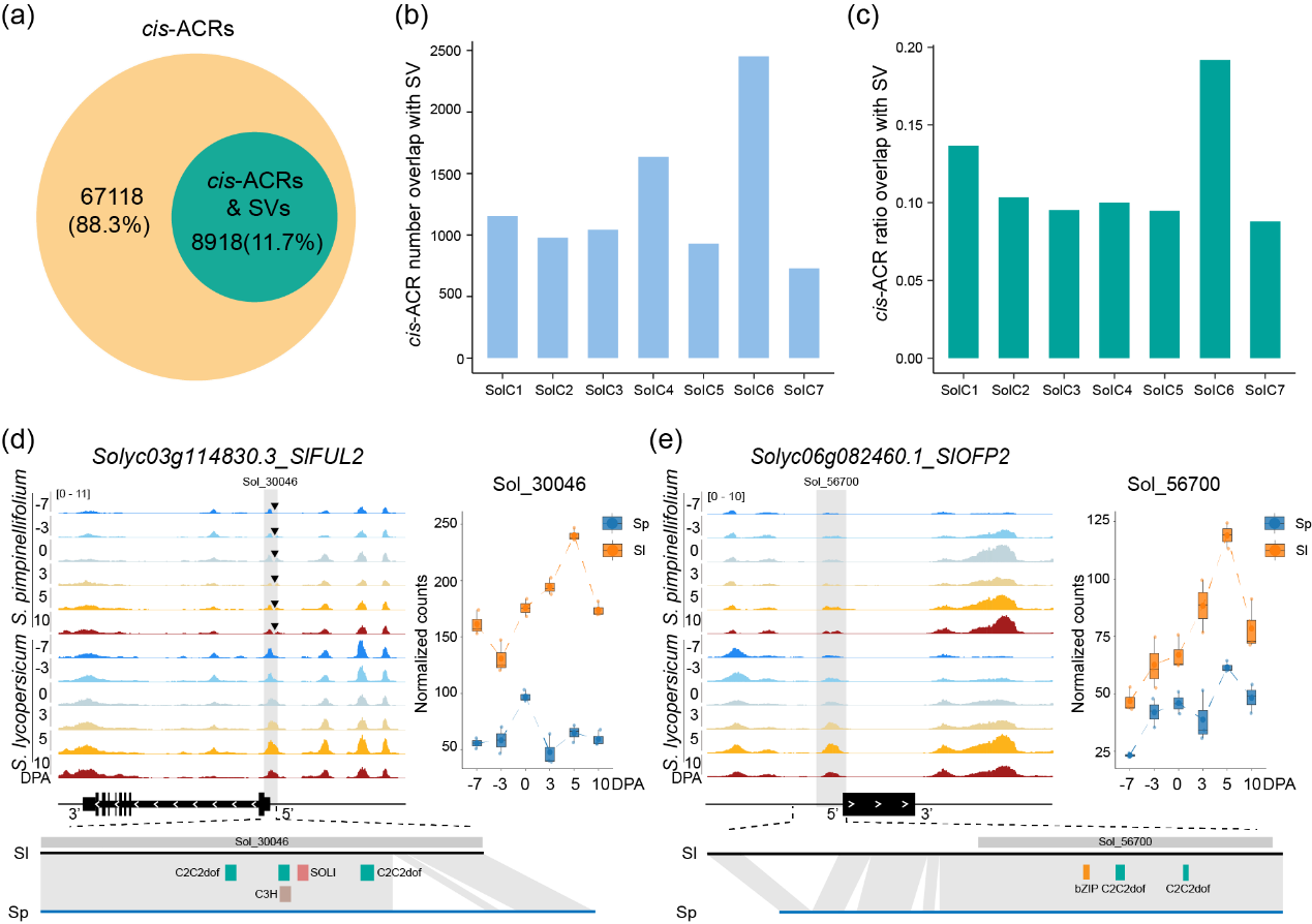 研究团队对野生番茄对应的6个发育时期果实进行了ATAC-seq,并与栽培番茄进行联合分析。结果显示,栽培番茄中特有的cis-ACRs类群中近20%与结构变异(SV)重叠(图2a、b、c),包括SlFUL2、SlOFP2等功能基因(图2d、e)。研究分析表明,SV造成的序列差异可能影响转录因子结合位点,从而改变基因表达水平,这为解析作物驯化过程中性状形成机制提供了新视角。