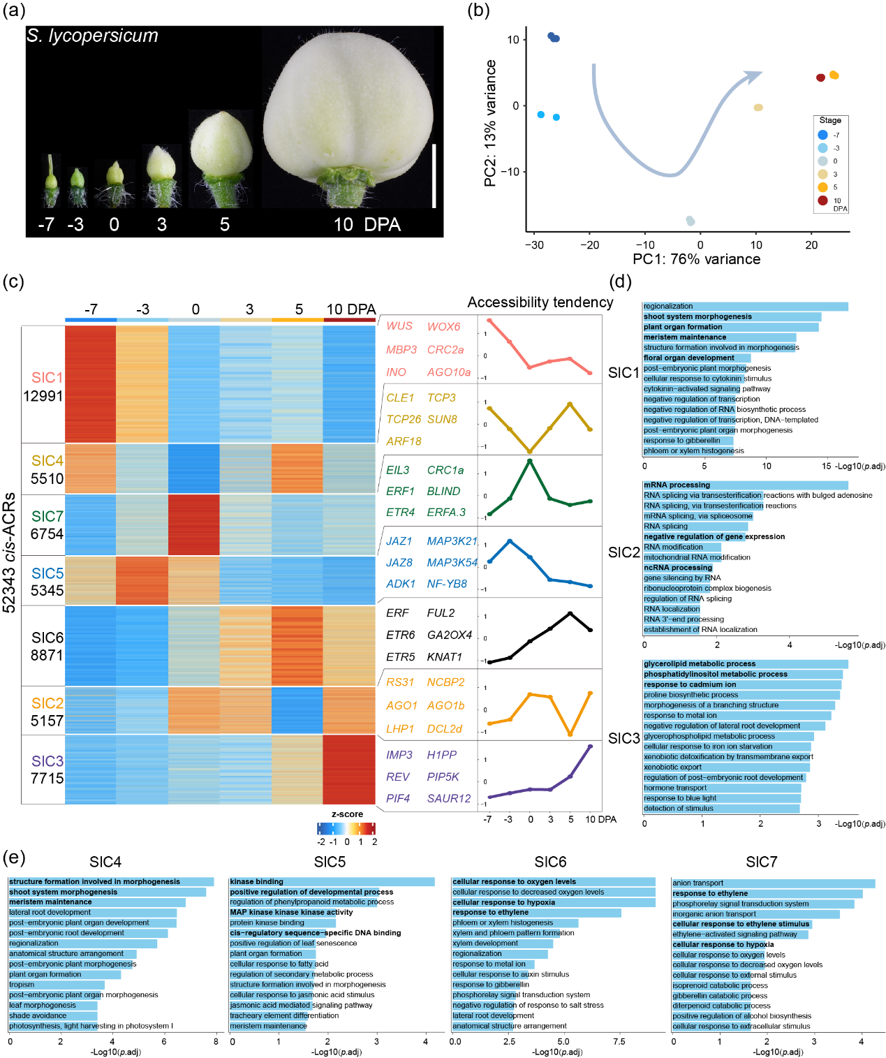 团队利用建立的ATAC-seq技术体系,对栽培番茄从开花前7天至授粉后10天6个关键发育阶段果实进行测序(图1a、b),cis-ACRs在果实发育早期、授粉期和授粉后表现出显著的可及性差异(图1c),分析显示cis-ACRs广泛参与番茄的发育调控(图1d、e),表明cis-ACRs的系统发掘为解析番茄果实发育调控的分子机制提供了关键线索。