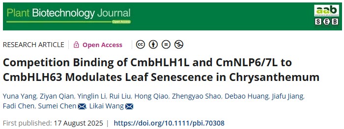 近日,万象城awcsport官网菊花遗传与种质创新团队在《Plant Biotechnology Journal》期刊在线发表了题为“Competition Binding of CmbHLH1L and CmNLP6/7L to CmbHLH63 Modulates Leaf Senescence in Chrysanthemum”的研究论文。该研究揭示了CmbHLH1L-CmbHLH63-CmNLP6/7L核心转录复合体通过调控硝酸盐感受器CmNLP6/7L的表达,影响叶片衰老的分子机制。