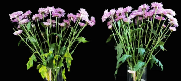 图2 瓶插液中添加硝酸钾可显著延长切花寿命。左图为对照,右图为添加硝酸钾处理。
