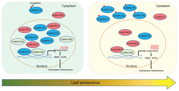 进一步的互作蛋白筛选表明,CmbHLH63通过竞争性招募转录抑制子CmbHLH1L和转录激活子CmNLP6/7L,调控下游CmNLP6/7L的表达。研究还发现,在叶片衰老过程中,细胞核内的CmbHLH1L分布信号减弱,而细胞质内的信号增强。去除CmbHLH1L核定位序列会显著减少该蛋白在细胞核中的分布,影响其调控叶片衰老的能力。质谱分析显示,CmbHLH1L在衰老过程中发生乙酰化修饰,其中第140位赖氨酸(K140)的乙酰化会阻碍其核定位,导致该蛋白在细胞质中积累,减少与CmbHLH63的互作,从而通过影响下游CmNLP6/7L的表达及对叶片衰老的调控。