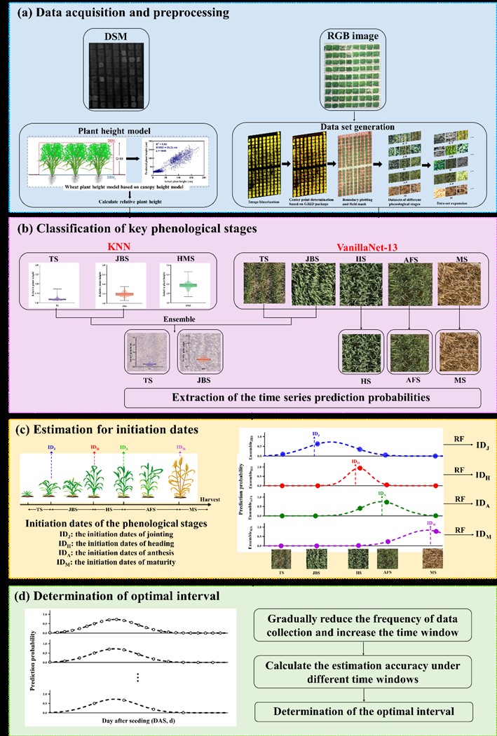 团队利用无人机RGB影像智能监测小麦种质资源物候期,以A.E. Watkins品种种质资源(沃氏小麦,John Innes Centre保藏的百年前收集的全球小麦种质资源,827份地方品种)和220份现代品种(图1)为研究对象,获取了时序无人机RGB时间序列图像,融合图像的颜色、纹理与冠层高度信息,构建了基于时序RGB图像耦合机器学习的定量模型,实现小麦关键物候阶段的高通量识别与起始日期的精准估算(图2)。