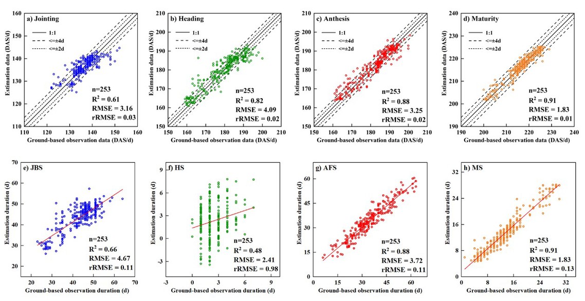 图3 随机森林模型对(a)拔节期、(b)抽穗期、(c)开花期和(d)成熟期起始日期的估算结果,以及相应的(e) JBS、(f) HS、(g) AFS和(h) MS持续时间的估算结果