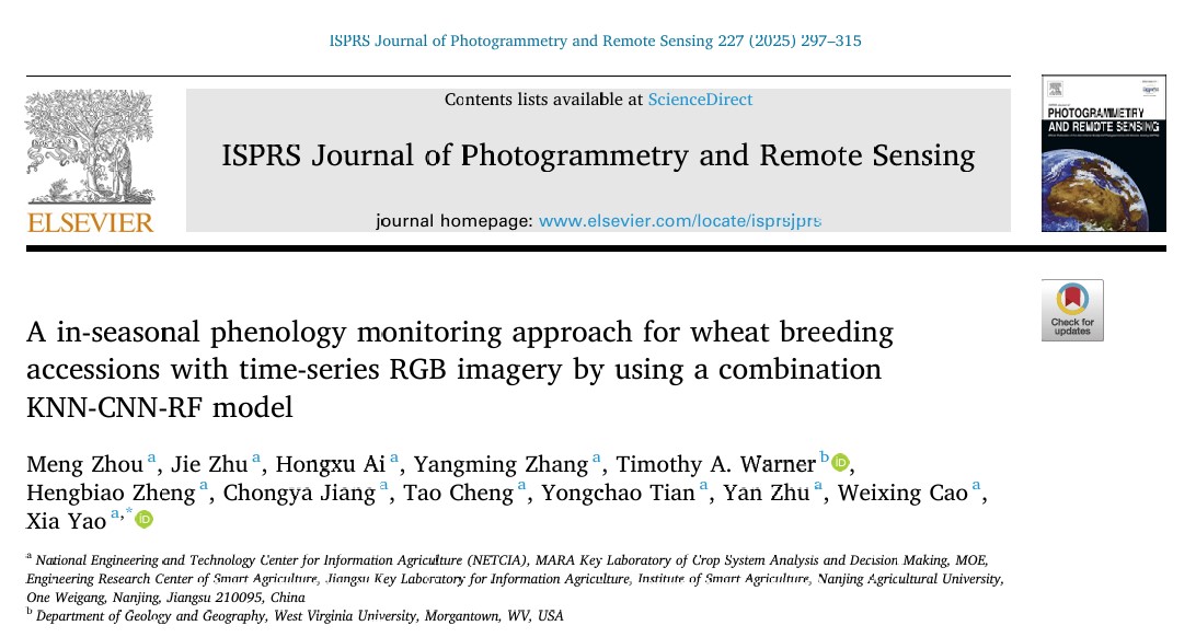 近日,万象城awcsport官网农学院智慧农业团队在国际著名顶级遥感期刊《ISPRS Journal of Photogrammetry and Remote Sensing》上发表题为“A in-seasonal phenology monitoring approach for wheat breeding accessions with time-series RGB imagery by using a combination KNN-CNN-RF model”的论文,该研究将有效服务智慧育种,保障粮食安全。
