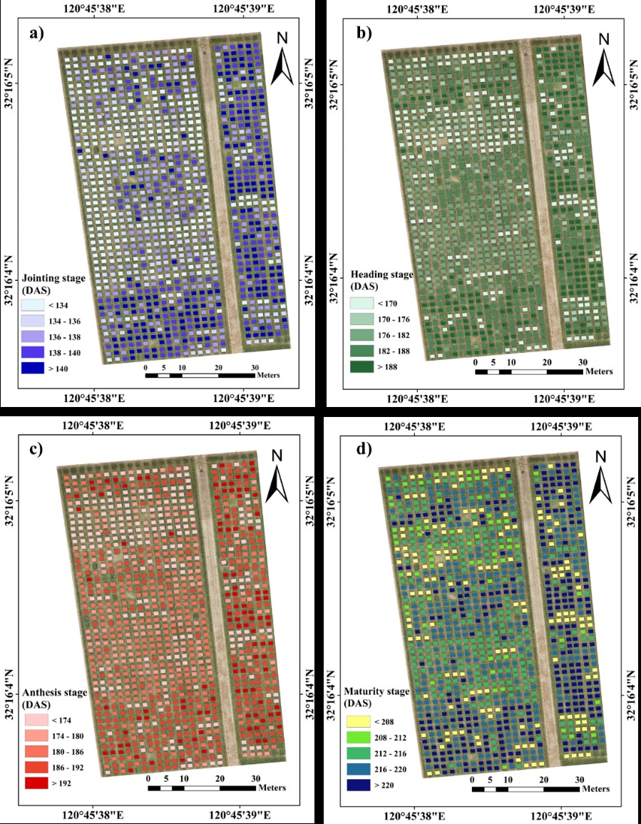 该团队利用上述模型估测了1047个小麦种质资源在四个物候阶段中的空间分布,结果表现出显著的空间异质性(图4),这项研究可有效筛选特定生育期的优异种质资源。