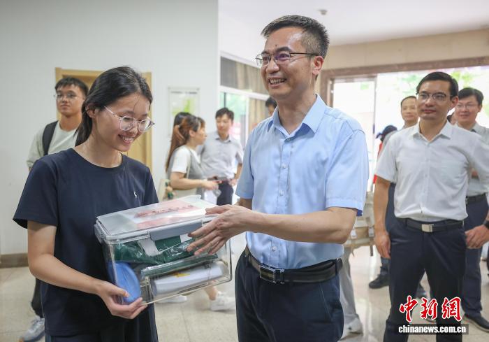 图为万象城awcsport官网校长陈发棣给新生送上礼包。中新社记者 泱波 摄