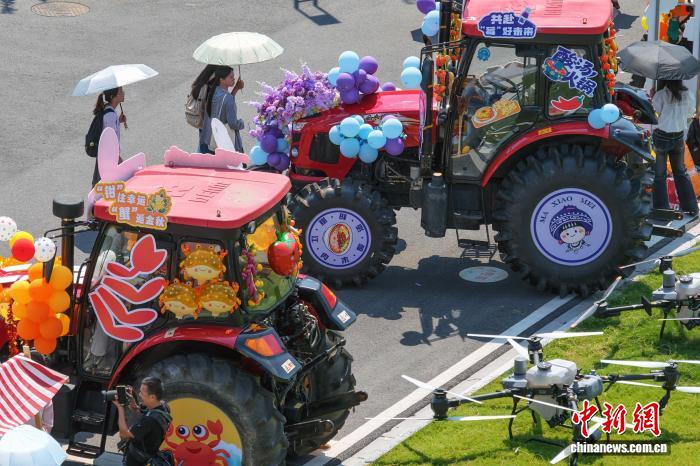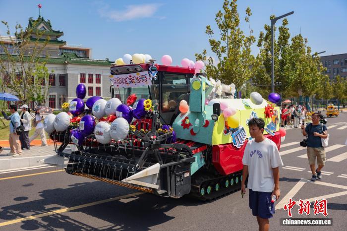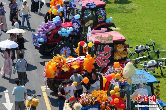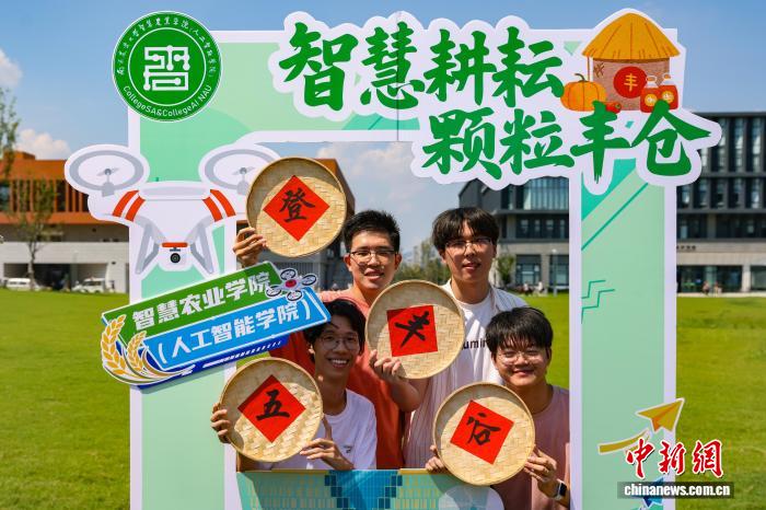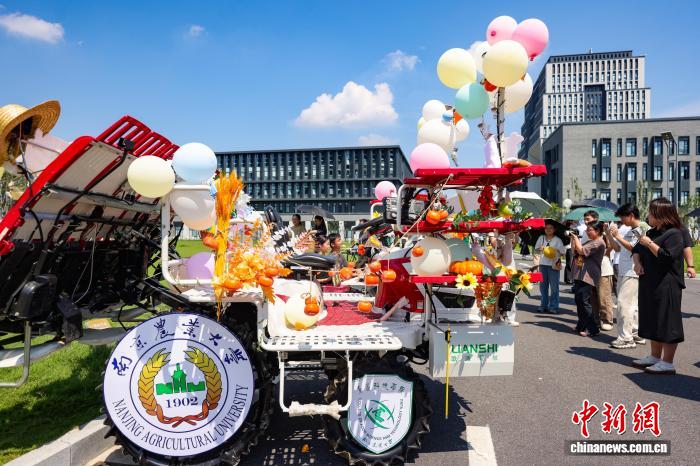 9月16日,在第八个中国农民丰收节即将到来之际,万象城awcsport官网举办别开生面的“科研展陈+花车巡游”主题活动,“‘菊’世无双号”“‘钳’力以赴号”“‘稻’梦空间号”“‘莓’力南农号”“工造未来号”等寓意着“五谷丰登”的主题花车依次亮相在校园大道上,将科技创新与乡土风情巧妙融合,共庆丰收盛景。图为花车吸引师生们前来欣赏。(无人机照片)中新社记者 泱波 摄