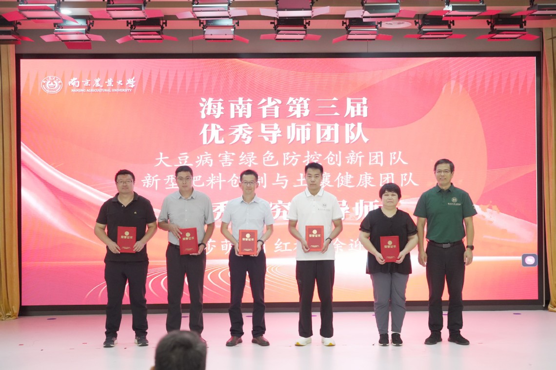 与会领导为荣获海南省优秀研究生导师、优秀导师团队,获得三亚研究院奖教金、奖学金的师生代表颁发证书;为企业代表颁发三亚研究院企业导师聘书。
