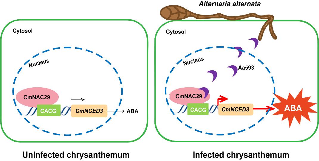 园艺院 | 菊花遗传与种质创新团队揭示链格孢菌效应蛋白Aa593通过劫持菊花CmNAC29介导的脱落酸生物合成路径促进侵染