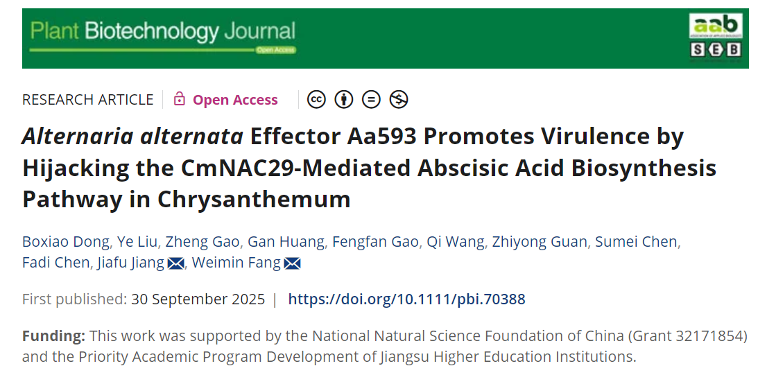 近期,园艺学院菊花遗传育种与种质创新团队在国际知名期刊Plant Biotechnology Journal发表了题为 “Alternaria alternataeffector Aa593 promotes virulence by hijacking CmNAC29-mediated abscisic acid biosynthesis pathway in chrysanthemum”的论文,揭示了菊花黑斑病菌效应蛋白Aa593通过劫持菊花转录因子CmNAC29介导的脱落酸(abscisic acid,ABA)生物合成路径,促进病原真菌的侵染和定殖。