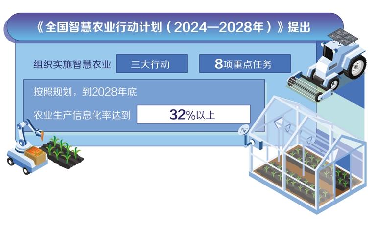 《全国智慧农业行动计划(2024—2028年)》提出,在公共服务能力建设上,加快打造国家农业农村大数据平台、农业农村用地“一张图”和基础模型算法等公共服务产品;在产业布局上,着力推动主要作物大面积单产提升,培育一批智慧农场、智慧牧场、智慧渔场,推进全产业链数字化改造;在示范带动上,支持浙江先行先试,探索推广“伏羲农场”等未来应用场景。