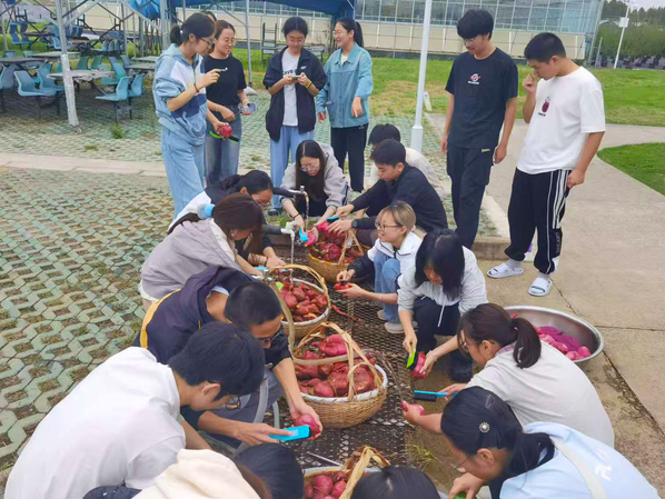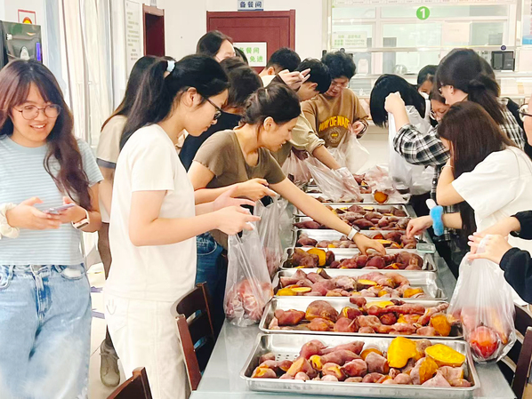 基地工作人员同时备好了蒸锅,热气腾腾的红薯新鲜出炉、香气四溢,师生们围坐一堂,品尝丰收喜悦。