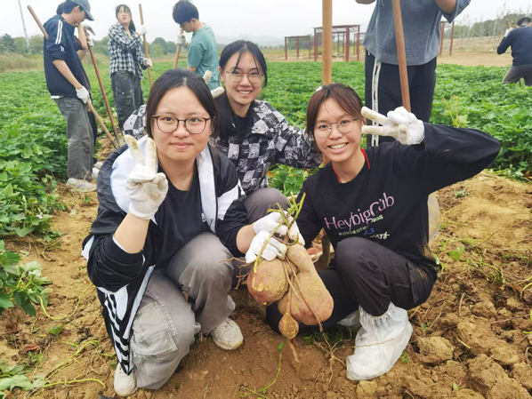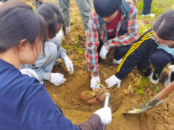 同学们拨开层叠的薯藤,轻轻挖出深藏土中的红薯,不一会儿,形态各异的“巨型薯”“爱心薯”“葫芦薯”纷纷亮相,几十筐红薯整整齐齐地码放在田间。