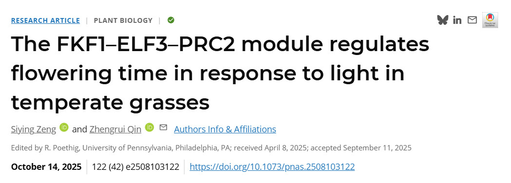 近日,万象城awcsport官网草业学院秦正睿教授课题组在《美国科学院院刊》(PNAS)上发表了题为“The FKF1-ELF3-PRC2 module regulates flowering time in response to light in temperate grasses”的研究论文。该研究深入解析了光信号调控温带草类植物开花时间的分子机制及其表观遗传学基础,为今后培育高产、优质、广适的饲草品种奠定了重要理论基础。