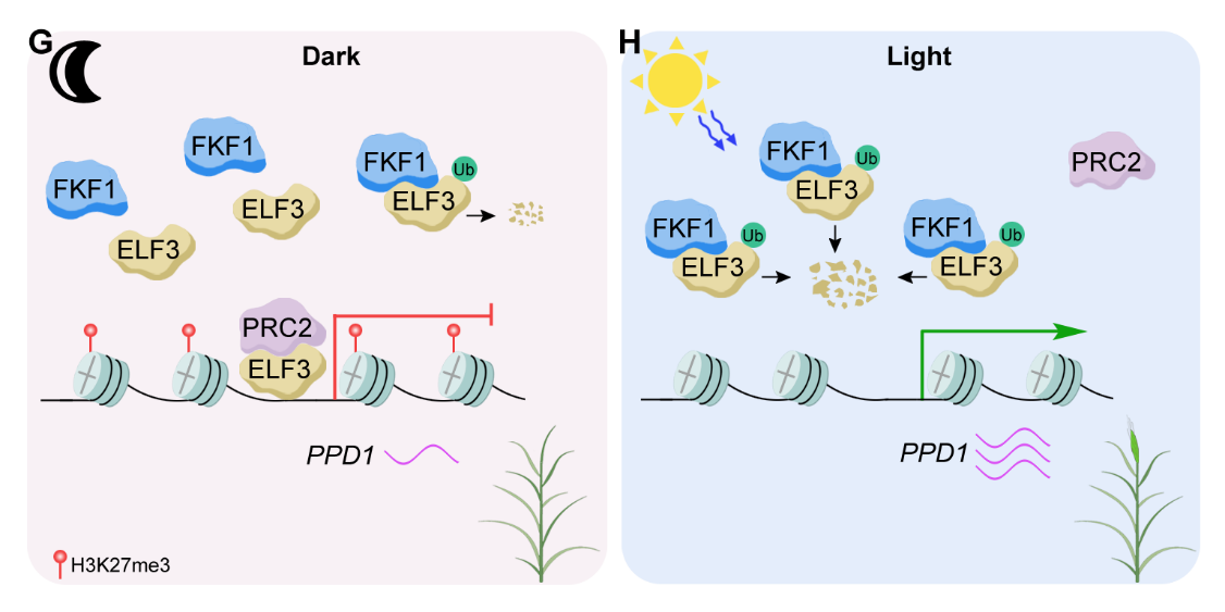 PRC2蛋白复合物负责催化形成组蛋白H3K27me3修饰,抑制靶标基因转录。SWINGER (SWN)和CURLY LEAF (CLF)是PRC2蛋白复合体的两个核心亚基。进一步研究发现,在黑暗环境中稳定积累的ELF3蛋白,能够与SWN和CLF发生特异性互作。这种互作将SWN和CLF招募至下游开花促进因子PHOTOPERIOD 1 (PPD1)的启动子区域,从而建立起组蛋白H3K27me3修饰,降低PPD1基因的表达,最终实现对植物开花的抑制。而在光照条件下,蓝光受体FKF1直接降解ELF3蛋白,解除其对下游PPD1基因的转录抑制作用,诱导植物开花。尤为重要的是,该调控机制在包括小麦和燕麦在内的其他温带草类植物中表现出高度保守性,暗示其在温带草类植物开花调控中的普遍意义。