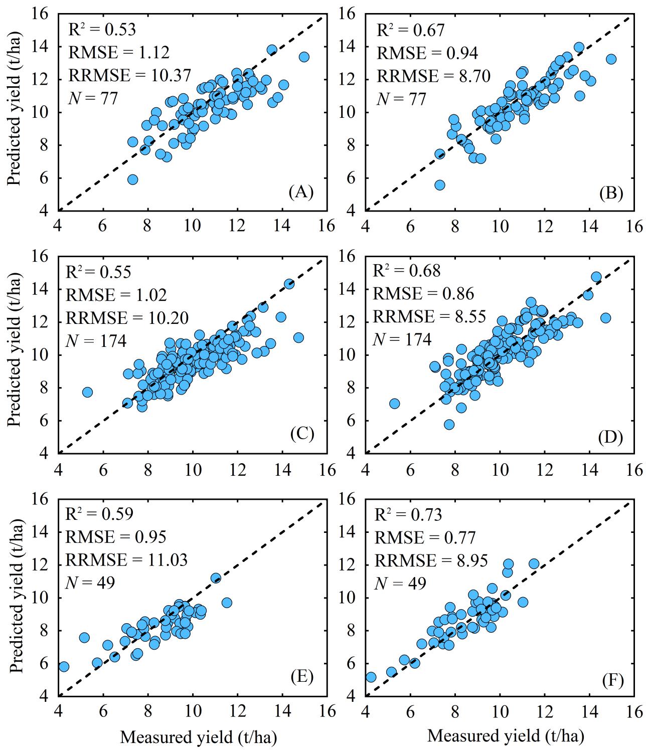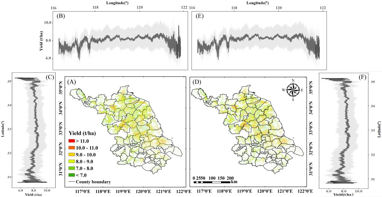 本研究提出的CGC方法在不同水稻生产区(江苏和黑龙江)的产量预测中表现良好,并且在独立年份的产量预测精度(R2 = 0.55 ~ 0.73)高于迁移学习算法的预测结果(R2= 0.54 ~ 0.62)。该方法无需大量地面实测样本,在年平均产量存在明显差异的年份(2019)和极端高温年份(2022)中,产量预测均表现良好(图6)。未来研究可以将它迁移到其他地区或更多年份,用于更大面积作物单产和总产的准确高效预测。该研究首次提出了一种基于高空间分辨率GPP的轻量化水稻产量跨年份预测方法,在少量实测样本条件下实现高精度单产预测,攻克了大范围水稻单产预测模型年际迁移性差的难题,突破了目前植被指数预测方法精度不高的限制(图7和8)。该技术明确了遥感GPP产品在水稻单产预测中的地位与应用价值,深化了对GPP与作物光合生产关系的理解,为现有GPP产品在农业遥感领域的应用拓展提供了新思路。同时,该研究为农业管理部门和规模种植大户等新型经营主体提供了准确、客观、及时的田块级产量预测手段,以更加有效应对气候变化和病虫害的影响,提高农业生产的韧性和可持续性。