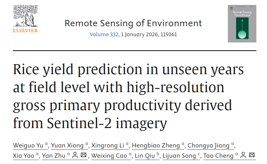近日,智慧农业学院(人工智能学院)智慧农业创新团队在国际著名顶级遥感期刊《Remote Sensing of Environment》发表了题为“Rice yield prediction in unseen years at field level with high-resolution gross primary productivity derived from Sentinel-2 imagery”的研究论文,报道了他们在大面积水稻单产卫星遥感预测技术方面的重要进展。