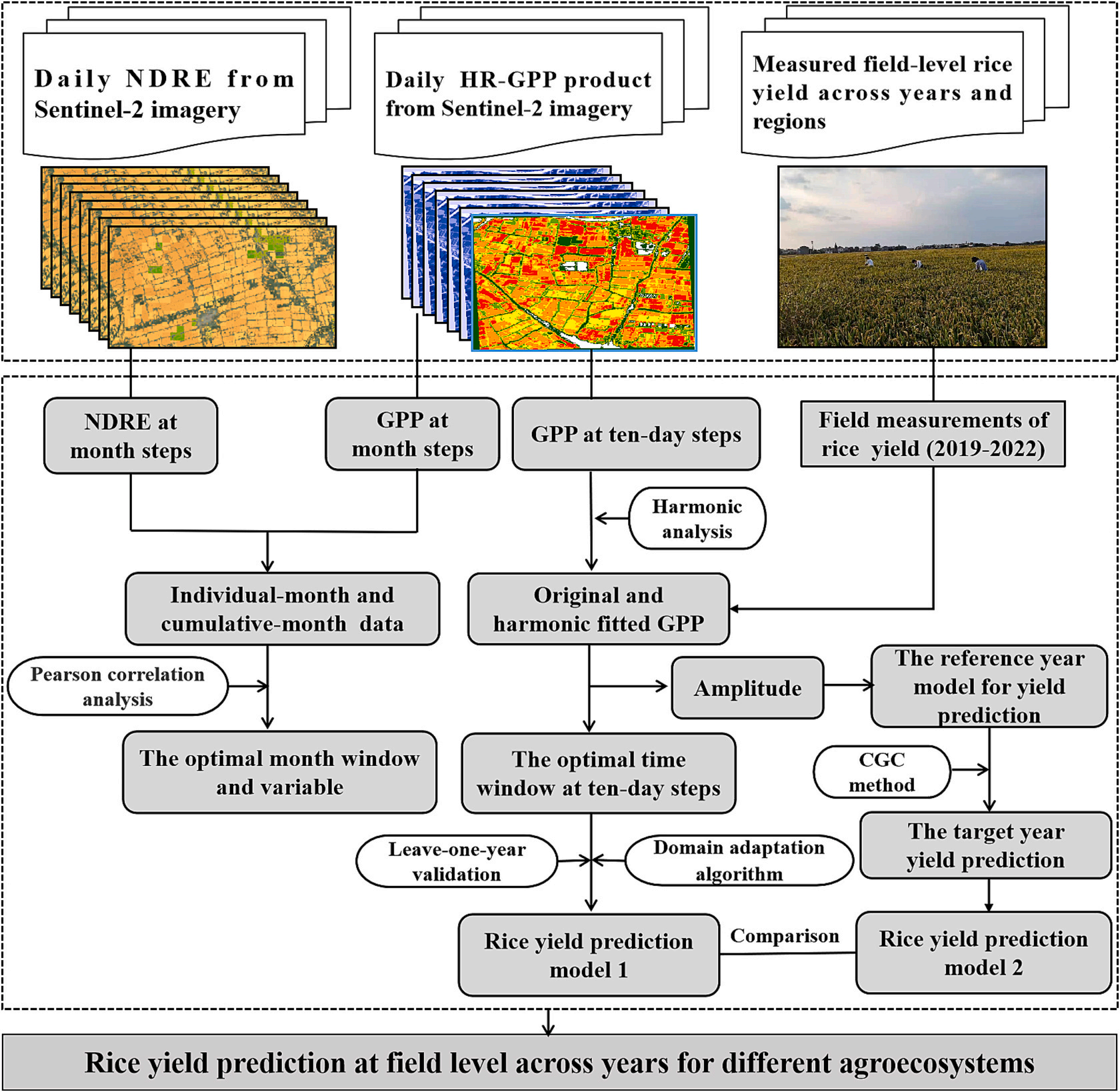 该研究首先基于不同年份高空间分辨率GPP遥感产品、田块实测产量数据和时间序列谐波分析法(图1),分析GPP和归一化差值红边植被指数(Normalized difference red edge index,NDRE)在月尺度上分别与水稻产量的相关性。此外,利用水稻生长季每10天间隔高分辨率GPP数据,确定水稻产量预测的最优时间窗口。然后利用迁移学习算法和最佳时间窗口高分辨率GPP与NDRE数据预测水稻产量(图2),解析GPP和植被指数NDRE在年际预测中的差异性。最后,提出适用于不同生态点的跨年度GPP校正(Cross-year GPP correction,CGC)方法(图3),并评价其在不同生态点对水稻产量预测的精度。