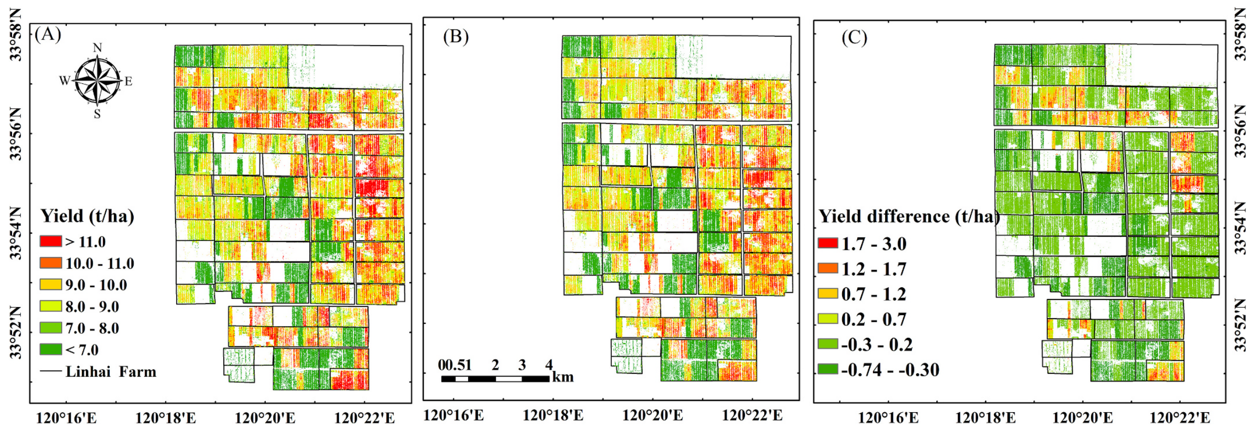 图8.基于2022年参考年模型预测的2021年江苏省临海农场水稻产量空间分布图