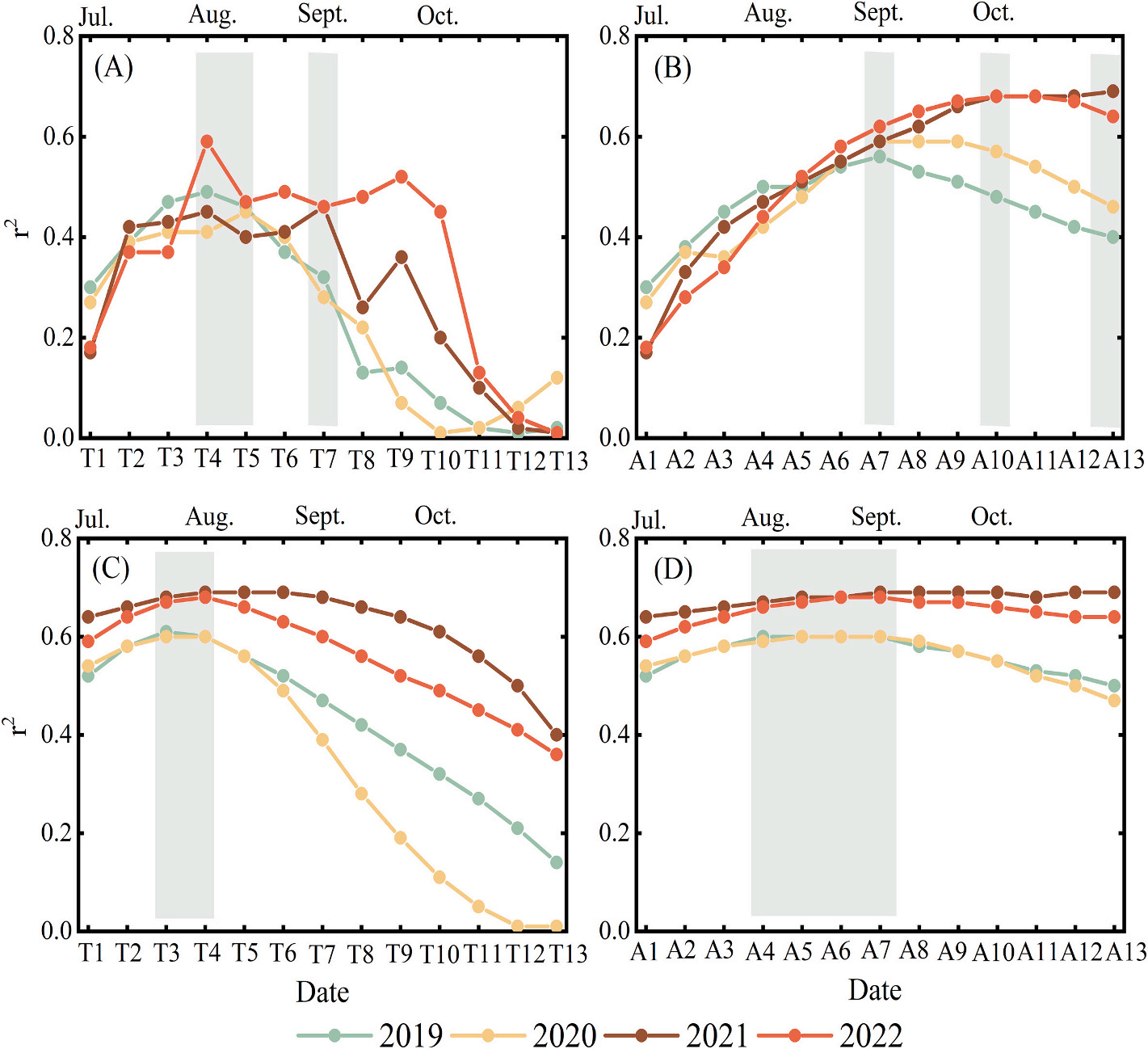 图4.江苏省田块级水稻产量与(A)GPP和(B)NDRE在四年间不同时间窗口(定义为[开始月份,结束月份])的皮尔逊相关系数平方值