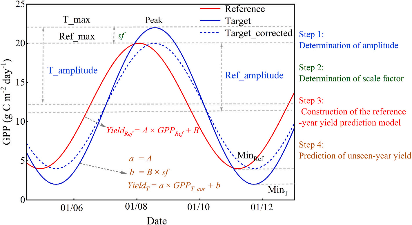 图3.基于目标年份的时间序列GPP曲线对参考年份GPP曲线的跨年度GPP校正(CGC)方法示意图