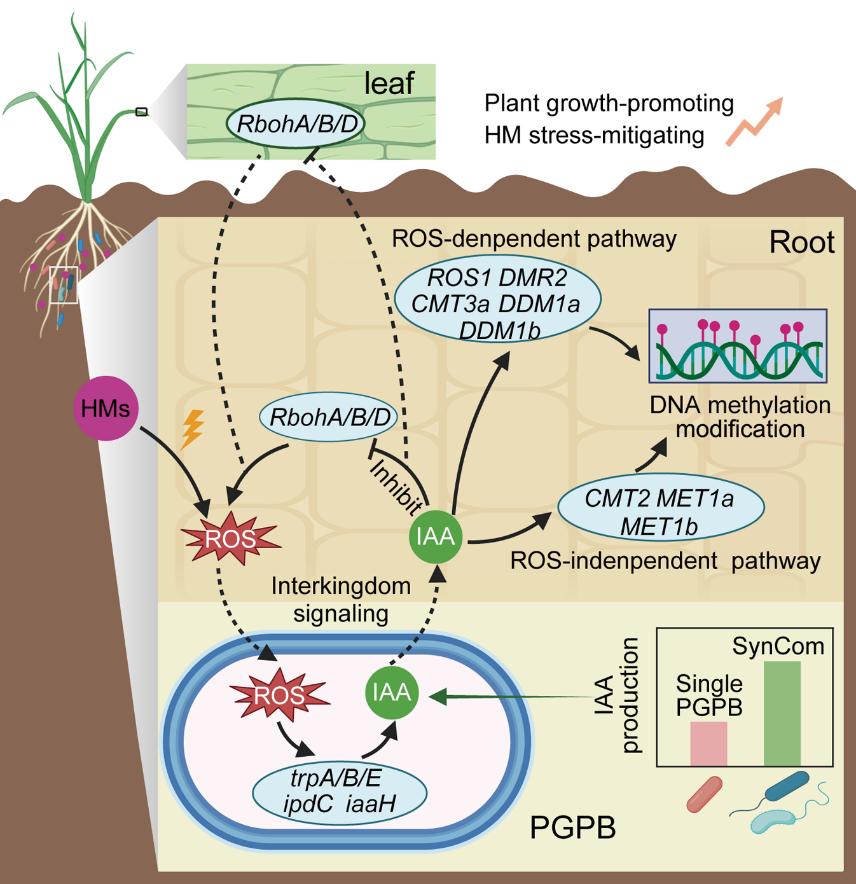 研究进一步揭示,根际促生菌所产生的IAA能够诱导根系中与DNA甲基化相关基因的表达,从而对根系DNA的甲基化状态进行调控。植物产生的ROS在这一调控过程中发挥着重要作用。综上,该研究揭示了重金属胁迫下植物与根际微生物相互作用的新跨界信号通路,即“植物ROS-根际微生物IAA-宿主甲基化”通路。