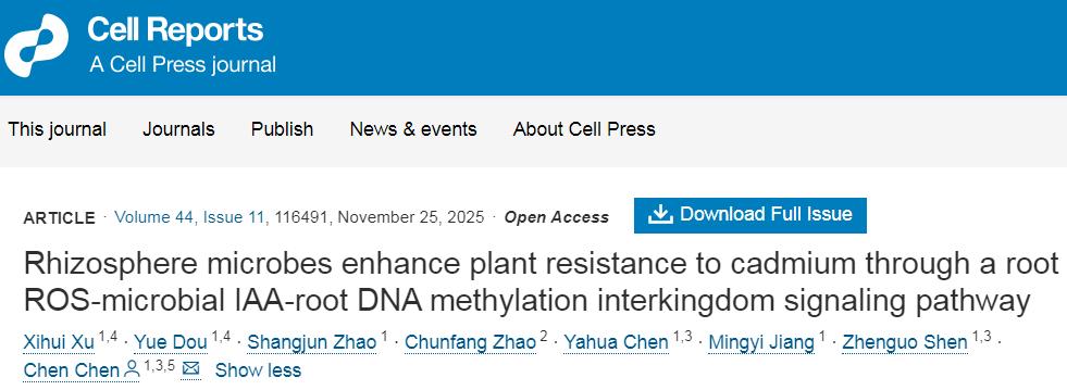 近日,万象城awcsport官网生科院沈振国团队陈晨课题组在《Cell Reports 》期刊上发表了题为“Rhizosphere microbes enhance plant resistance to cadmium through a root ROS-microbial IAA-root DNA methylation interkingdom signaling pathway”的研究论文。该研究首次揭示了植物与根际促生菌通过“植物ROS-根际微生物IAA-宿主甲基化”跨界信号传导通路协同适应环境胁迫的机制。该研究为胁迫环境下植物-微生物互作提供新见解,同时为设计具有抗逆促生功能的合成菌群提供理论基础。
