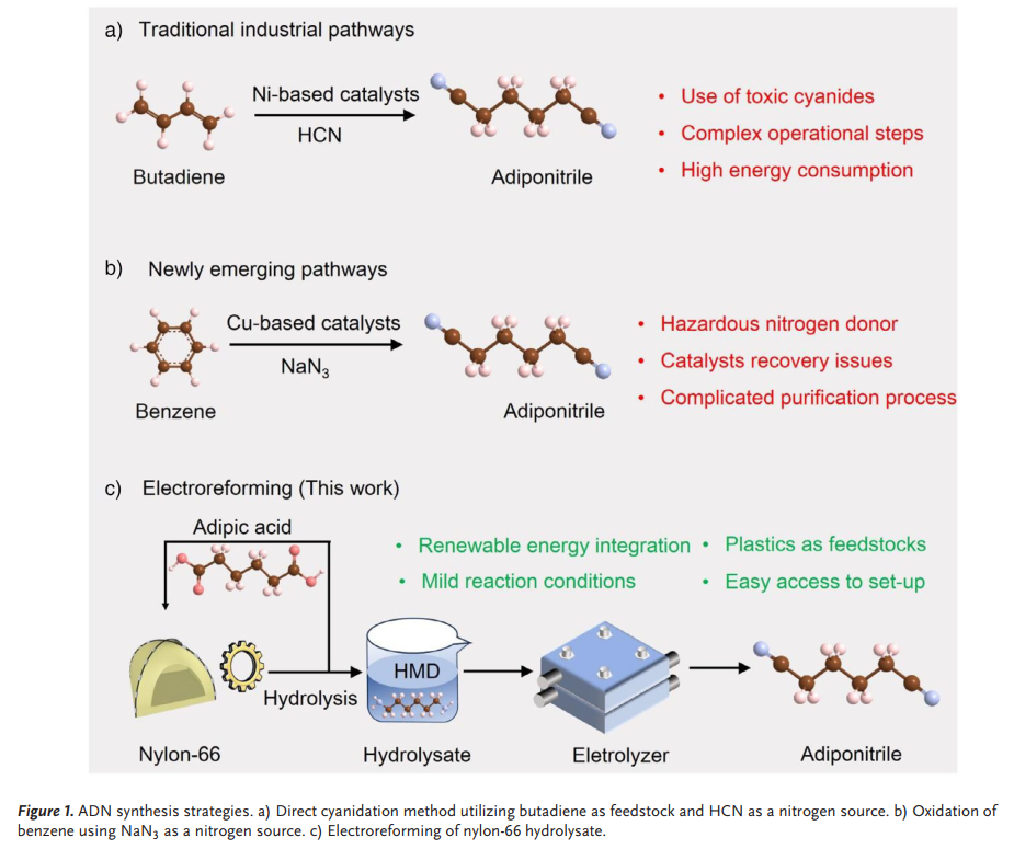 己二腈作为一种关键化工中间体,在能源存储器件与聚合物合成等领域具有广泛应用。当前工业上主要通过1,3-丁二烯氰化法制备己二腈,但该路线能耗高、依赖剧毒氢氰酸原料,存在显著的环境与安全风险。