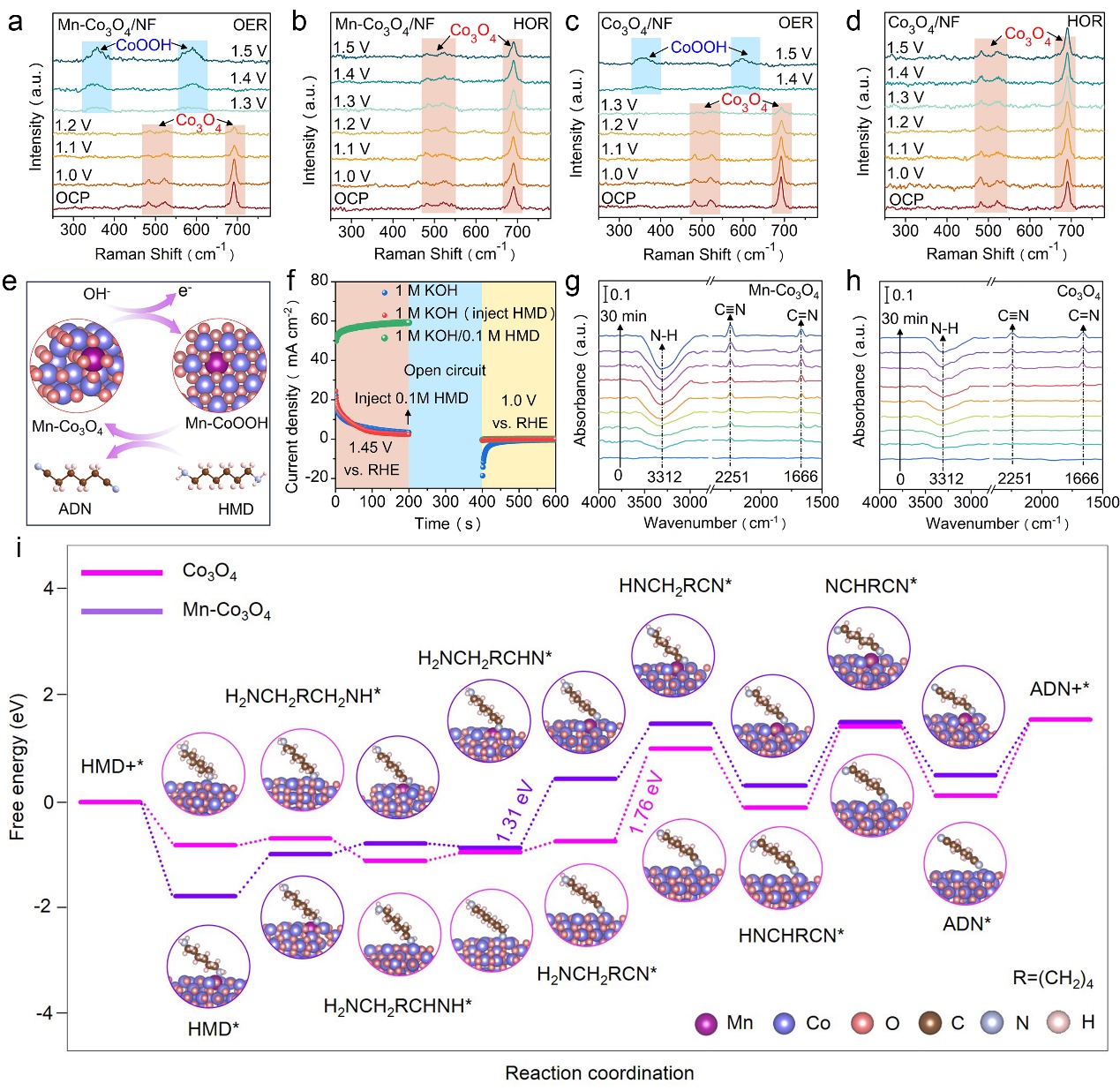 该研究发展了一种基于Mn掺杂的Co3O4Mn-Co3O4)催化剂的新型电重整策略,用于从废弃的尼龙-66塑料中高效合成己二腈。MnCo位点的协同作用有效活化了N-H键,从而驱动Mn-Co3O4200 mA cm−2的高电子密度下,实现了己二腈的高效合成,其法拉第效率高达93%,产生速率达0.87 mmol cm−2 h−1