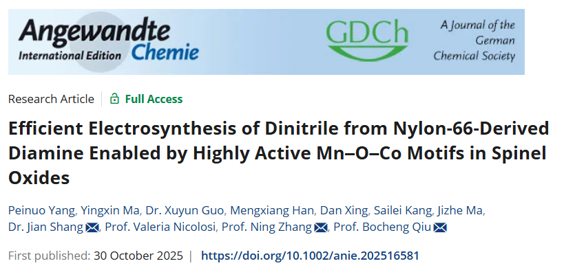 近日,理学院邱博诚教授团队在化学化工类顶级期刊《Angewandte Chemie International Edition》在线发表题为Efficient Electrosynthesis of Dinitrile from Nylon-66-Derived Diamine Enabled by Highly Active Mn-O-Co Motifs in Spinel Oxides的研究论文。该研究实现了以废弃尼龙扎带为原料合成高值化学品己二腈,为己二腈的绿色合成提供了新方法,也为废弃尼龙塑料的资源化利用开辟了一条新途径。