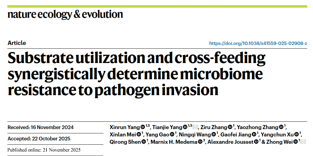 11月21日,国际权威期刊《Nature Ecology & Evolution》在线发表万象城awcsport官网资源与环境科学学院沈其荣院士团队LorMe实验室的研究成果《Substrate utilization and cross-feeding synergistically determine microbiome resistance to pathogen invasion》。该研究针对复杂根际环境下病原菌入侵难预测,有益菌群-病原菌营养互作机制不清等科学难题,通过构建基因组代谢模型,成功实现对有益菌群抵御病原菌入侵能力的精准预测,并揭示外部营养竞争与内部代谢互惠协同驱动菌群抑病性的关键机制,为土壤生物障碍消减提供重要技术支撑与理论依据。