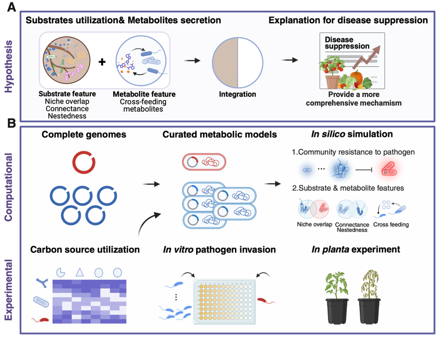 土传植物病原菌肆虐全球,严重威胁粮食安全。植物根际富含大量碳源,是土壤微生物活动的重要热区,也是抵御土壤病原菌入侵的第一道防线。然而,根际微生物组多样、营养环境复杂,如何高效地预测菌群抑病能力仍存在重大挑战。此外,已有大量研究表明高多样性的菌群抑病能力更强,但菌群内部及其与病原菌的营养互作机制尚未清楚探明。阐明上述科学问题对于理解土壤微生态健康、实现农业可持续生产具有重要科学意义。