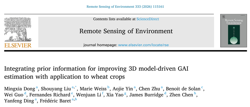 近日,中法植物表型国际联合实验室在遥感领域顶级期刊《Remote Sensing of Environment》在线发表了题为“Integrating prior information for improving 3D model-driven GAI estimation with application to wheat crops”的研究论文,提出“融合先验知识与三维数字孪生”的新策略,显著提升了跨生态点、多品种小麦全生育期监测的精度,为多站点联网表型监测提供了核心算法支撑。