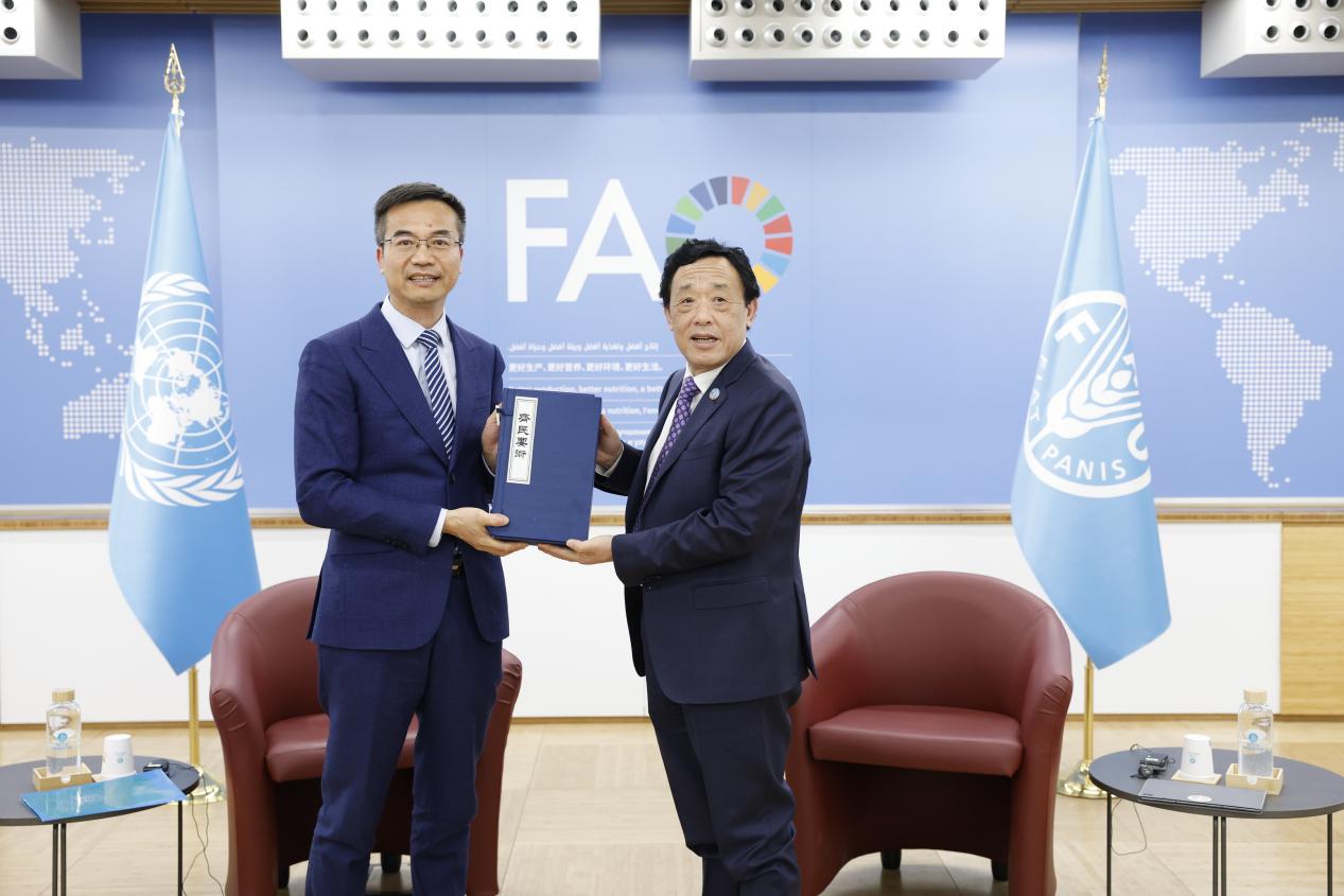 访问意大利期间,代表团拜会了联合国粮食及农业组织(FAO)总干事屈冬玉。屈冬玉对陈发棣一行到访表示欢迎,并表示,FAO与万象城awcsport官网的交流与合作有着深厚的历史渊源;面向未来,愿意着力支持双方在科学研究、人才培养等更广泛的领域开展实质性合作,为实现“四个更好”愿景积极贡献力量。陈发棣介绍了南农建设发展情况,以及与FAO合作实施的相关项目的最新进展和成果,并代表学校向FAO新建成的博物馆赠送万象城珍藏的明嘉靖刻本《齐民要术》的复制本,以祝贺FAO成立80周年。