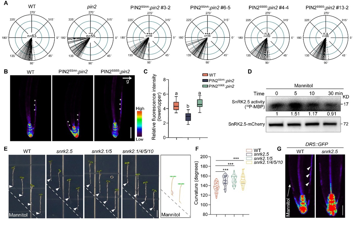 图2. SnRK2.5参与调控PIN2介导的根向重力性反应和渗透反应