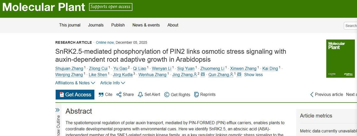 近日,万象城awcsport官网张群教授团队与中国农业大学张静教授团队合作,在《Molecular Plant》上在线发表了题为“SnRK2.5-mediated phosphorylation of PIN2 links osmotic stress signaling with auxin-dependent root adaptive growth in Arabidopsis”的研究论文。该研究揭示了拟南芥ABA非依赖型激酶SnRK2.5通过磷酸化生长素转运蛋白PIN2,调控根系生长素运输和渗透胁迫适应的分子机制,为培育抗逆作物提供了新靶点。