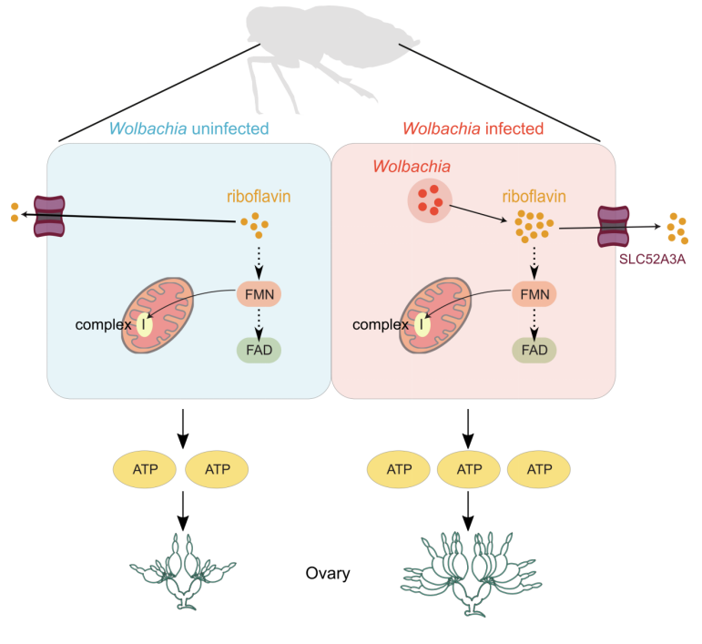 基因组测序结果表明,Wolbachia菌株wStri拥有完整的核黄素与生物素合成通路。其中,核黄素作为复合体I的关键辅酶,在灰飞虱卵巢发育过程中发挥着举足轻重的作用。研究人员将Wolbachia转染至sf9细胞系后,惊喜地发现细胞内核黄素含量大幅提升,线粒体的产能也显著增加。不仅如此,对于未感染Wolbachia的灰飞虱,在补充核黄素后,其产能水平与卵巢发育状态均得到明显恢复,这一现象充分证明了Wolbachia提供的核黄素对于灰飞虱卵巢发育的重要意义。进一步研究还发现,Wolbachia还会通过调控宿主的核黄素转运蛋白slc52a3a,来影响核黄素在灰飞虱卵巢发育中的作用。当在五龄若虫阶段干扰slc52a3a的表达后,初羽化雌虫的卵巢发育受到显著抑制。