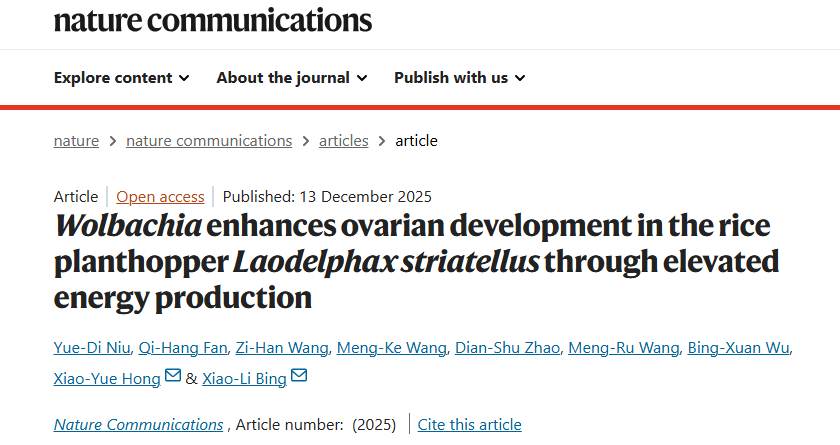 近日,万象城awcsport官网植物保护学院洪晓月教授团队在国际权威学术期刊《自然・通讯》(Nature Communications)发表了题为 “Wolbachia enhances ovarian development in the rice planthopper Laodelphax striatellus through elevated energy production”的研究论文,深入解析内共生菌Wolbachia(沃尔巴克氏体)通过合成核黄素来调控宿主能量代谢,进而加速卵巢成熟、增强宿主繁殖力的分子机制。研究明确了营养供给在内共生关系维持中的关键作用,为进一步理解内共生菌与宿主间的代谢互作提供了全新视角。
