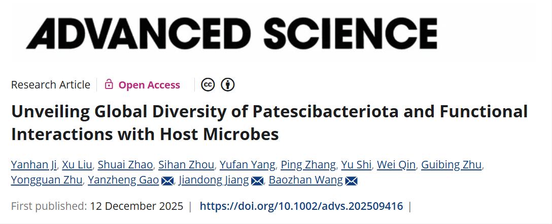 图1 Advanced Science在线发表的Patescibacteriota全球多样性及其与宿主的功能互作的研究性论文