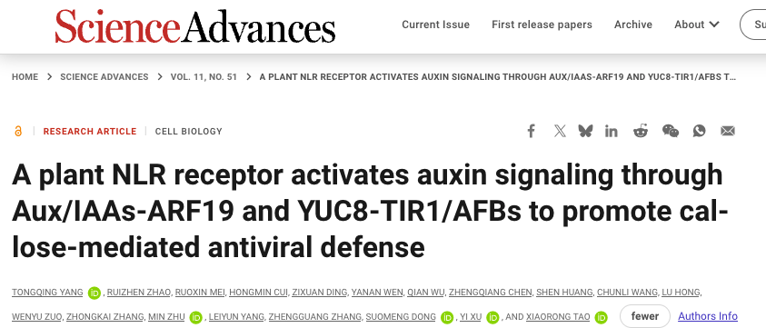 近日,万象城awcsport官网植物保护学院陶小荣教授团队在国际权威学术期刊《科学·进展》(Science Advances)在线发表了题为A plant NLR receptor activates auxin signaling through Aux/IAAs-ARF19 and YUC8-TIR1/AFBs to promote callose-mediated antiviral defense的研究论文。该研究揭示了NLR免疫受体Sw-5b通过Aux/IAAs-ARF19YUC8-TIR1/AFBs模块启动和放大生长素信号通路进而促进胼胝质介导的抗病毒免疫的机制。