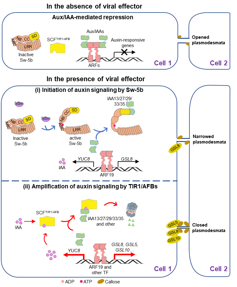 生长素响应因子ARFauxin response factor)是生长素信号通路中的转录因子,通过结合靶标基因启动子区的生长素响应元件AuxRE来调控生长素介导的生理过程。在胞内生长素(吲哚乙酸,IAA)浓度低时,ARF被转录抑制因子Aux/IAAs结合并阻止其启动下游基因的转录调节。该研究发现Sw-5b激活后通过SD结构域与多个Aux/IAA蛋白互作进而解除后者对转录因子ARF19的抑制。ARF19随后直接结合GLS8启动子促进胞间连丝胼胝质的积累。
