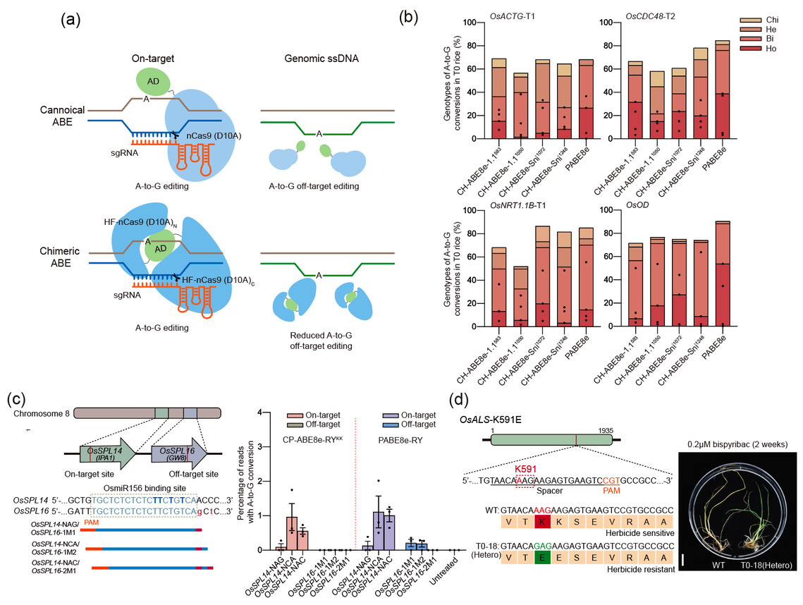 研究团队采用了“嵌入式”策略,将高活性的TadA8e蛋白“锁”在Cas9蛋白的特定柔性区域,筛选开发出4个CP-ABE版本,显著抑制sgRNA非依赖的脱靶编辑。进一步引入高保真Cas9蛋白(SniperCas9、eSpCas9(1.1)和Sniper2L),构建了CH-ABE编辑系统,将sgRNA依赖性和非依赖性的脱靶效应分别降低了高达7.0倍和79.4倍,并能够产生22.0%-72.4%的水稻纯合及双等位突变体。全基因组和全转录组测序(WGS/WTS)进一步证实了CH-ABEs在安全性方面的优化。
